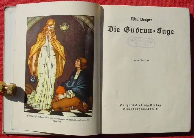 Will Vesper "Die Gudrun-Sage". 84 Seiten. Mit 1 farbigen Vollbild u. viele Federzeichnungen. 16. bis 20. Tausend. Halbleinen. Stalling-Verlag, Oldenburg, Berlin 1938