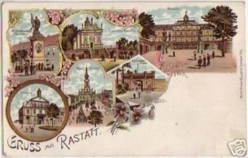 schöne farbige Lithographie, Schloss, Einsiedler Kapelle, St.Bernhardus Brunnen, Stadtkirche, Rathaus, Karlsruher Thor, ungelaufen, gute Erhaltung siehe Bild,