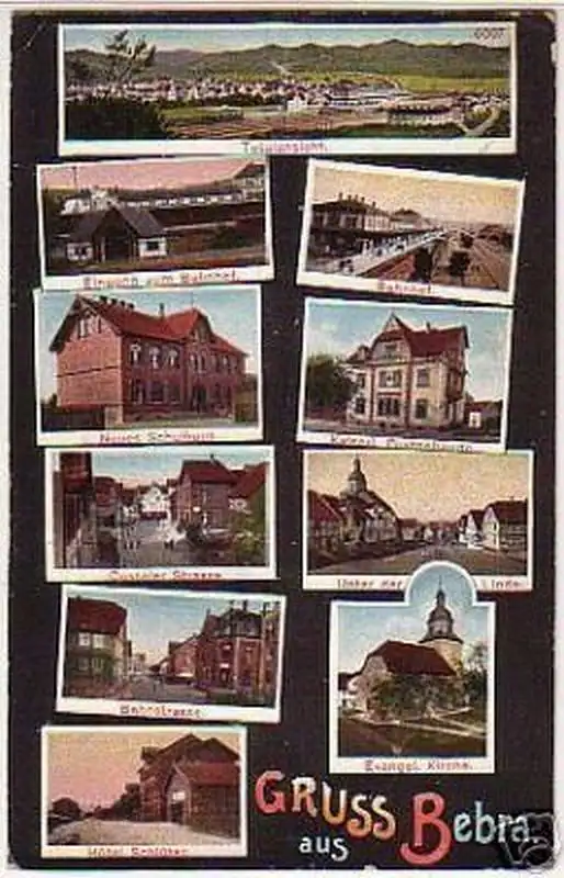 Totalansicht, Eingang zum Bahnhof, Bahnhof, neues Schulhaus, Kaiserl. Postamt, Casseler Straße, Unter den Linden, Bahnhstrasse, Evangelische Kirche, Hotel Schlüter, gelaufen, gute Erhaltung (kleiner Eckbug) siehe Bild,