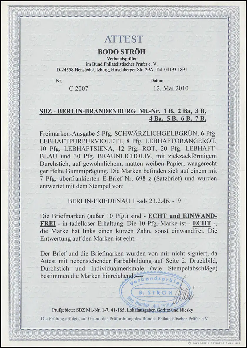 1-7 B durchstochen kpl. 7 Werte auf R-Brief Berlin 23.2.46, Fotoattest Ströh BPP