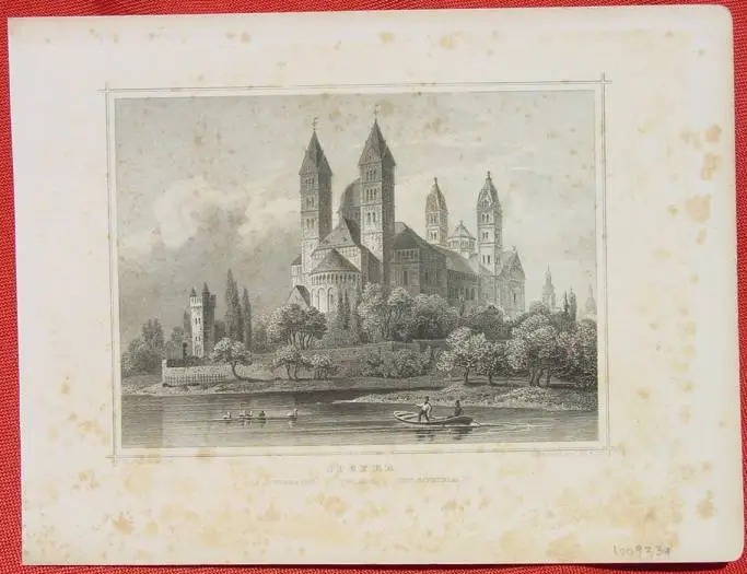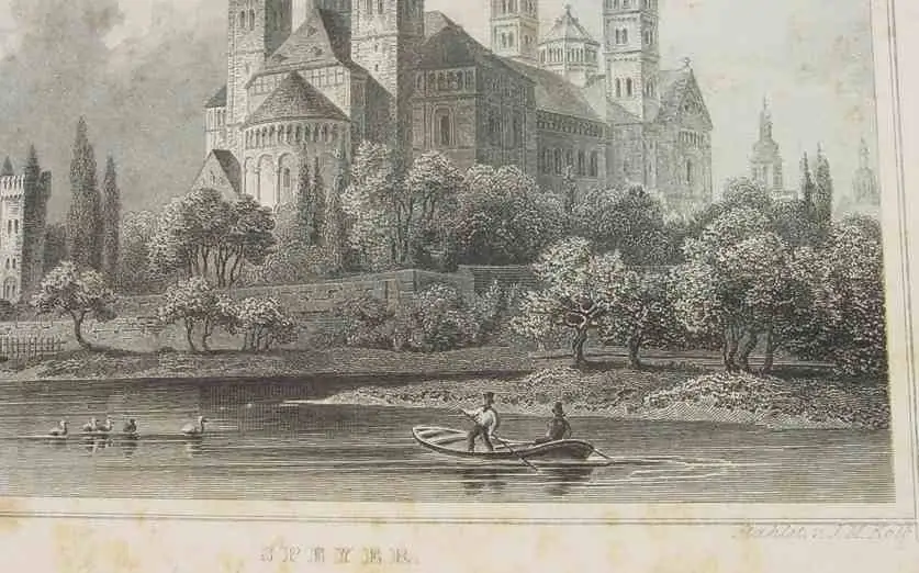 "Speyer - Der Dom". Herrliche Gesamtansicht vom Wasser her, Uferlandschaft, Kahn mit Leuten. Alter Stahlstich um 1880, gez. von L. Rohbock / St. v. J.M. Kolb. Bildgroesse ca. 15,5 x 12 cm. Entnommen einem alten Bildband ueber Rhein-Ansichten. Blatt hat starke Alterungsflecken