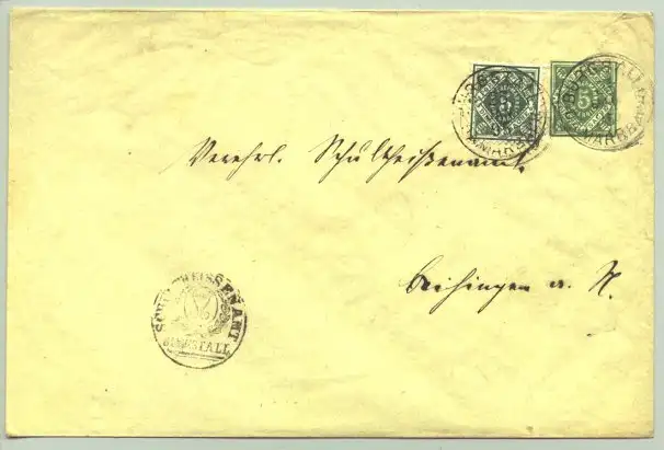 (1020337) Briefkuvert mit eingedruckter grüner 5 Pf.-Post-Frei-Marke (Ganzsache), daneben 5 Pf.-Briefmarke, abgestempelt "Burgstall O. A. Marbach, 23. Jan. 1895". Mit Zusatzstempel 'Schultheissen-Amt Burgstall". Rückseite Ankunftsstempel Beihingen. Gebrauchsspuren. PLZ-Bereich pauschal 71576. Eventuell auch für den Heimatsammler interessant ?