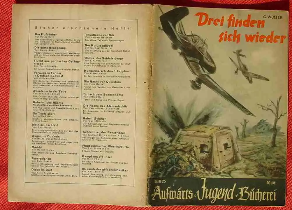 "Drei finden sich wieder" Von Gerhard Wolter. Erlebnisse 3 junger Männer im Zweiten Weltkrieg. Titelbild und Textzeichnungen von Erich Lüdke. Originalheft Nr. 25 der Reihe "Aufwärts-Jugend-Bücherei". 20-Pfennig-Hefte, je 40 Seiten, mehrfarbige Umschlagbilder. Propagandaheft für die Jugend aus dem Aufwärts-Verlag Berlin 1940-1944. Komplettes Heft in gutem Zustand. Siehe bitte Bild