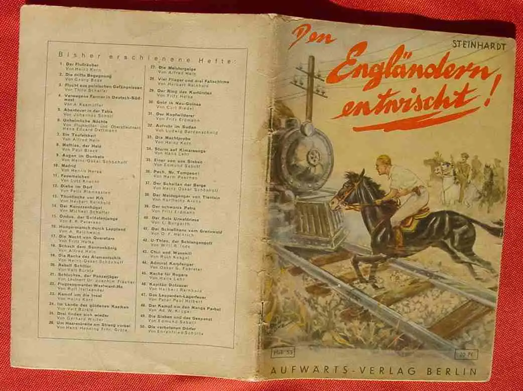 "Den Engländern entwischt !" Von Steinhardt. # Kolonien # Deutsch-Südwestafrika. Titelbild und Textzeichnungen von Erich Lüdke. Originalheft Nr. 53 der Reihe "Aufwärts-Jugend-Bücherei". 20-Pfennig-Hefte, je 40 Seiten, mehrfarbige Umschlagbilder. Propagandaheft für die Jugend aus dem Aufwärts-Verlag Berlin 1940-1944. Komplettes Heft in rundum noch guten Zustand, siehe bitte Bild