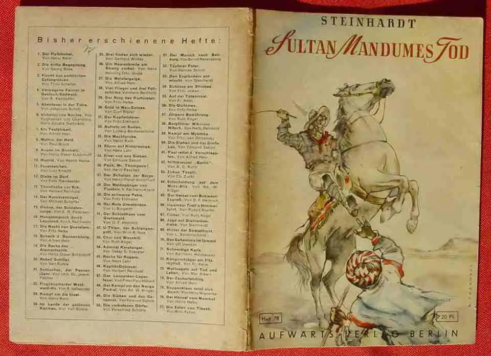 "Sultan Mandumes Tod" Von Steinhardt. Abenteuer in Deutsch-Südwestafrika # Deutsche Kolonien. Titelbild und Textzeichnungen von Kurt Teßmann. Originalheft Nr. 78 der Reihe "Aufwärts-Jugend-Bücherei". 20-Pfennig-Hefte, je 40 Seiten, mehrfarbige Umschlagbilder. Propagandaheft für die Jugend aus dem Aufwärts-Verlag Berlin 1940-1944. Komplettes Heft in rundum guten Zustand. Siehe bitte Bild
