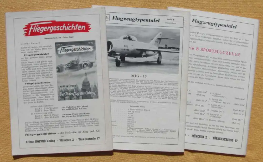 (1049702) 10 Hefte zum 'Kennenlernen' aus der Reihe "Fliegergeschichten". Einzelhefte. Arthur Moewig Verlag München 1953-1961. 32-64 Seiten. Natürlich alles verschiedene Hefte ! Zustand mehr oder weniger gebraucht, aber alle Hefte komplett mit Umschlaegen. Siehe bitte Bildbeispiele