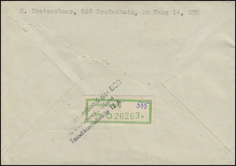 Auslandsbrief mit Aufkleber "Tauschsendung" und Stempel "Philatelistenverband der DDR im Deutschen Kulturbund / Tauschkontrollstelle 12 A" nach Liebefeld bei Bern / Schweiz.