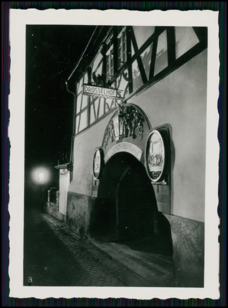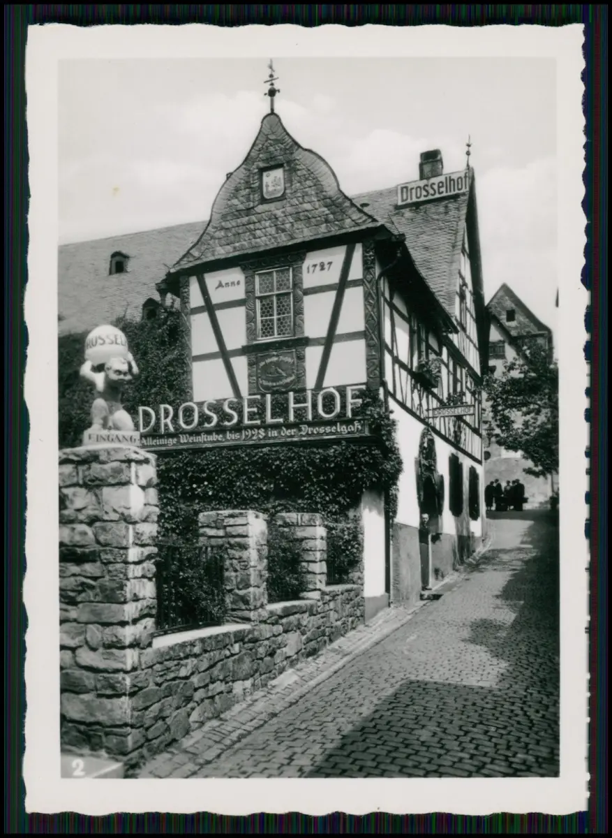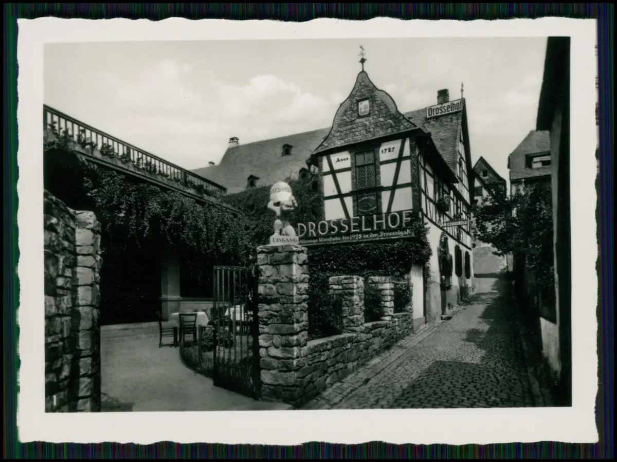 Das Drosselhof in Rüdesheim am Rhein ist eines der bekanntesten Fachwerkhäuser der Drosselgasse. Das Gebäude wurde 1787 erbaut und diente lange Zeit als Weinwirtschaft und beliebtes Ziel für Reisende am Rhein. Die Aufnahme zeigt den traditionsreichen Gasthof mit seinem markanten Fachwerkgiebel und dem Schriftzug „Drosselhof“. Laut historischen Quellen war das Haus ein zentraler Treffpunkt der Weinkultur in der Region Rheingau.