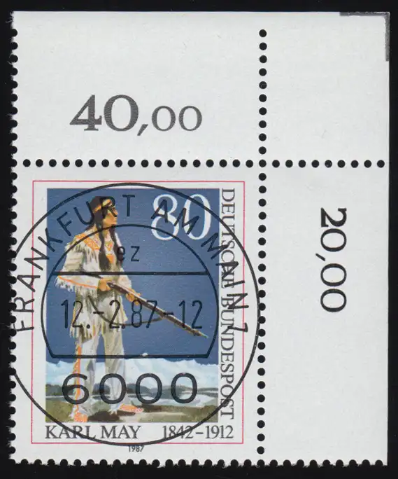 Bogenecke mit amtlich zugedrucktem korrigierten Bogenwertzähler. Dieser wird von der Post rechts oben auf dem Bogen nach erfolgter Bogenstempelung angebracht, um der Tatsache Rechnung zu tragen, dass bei der Stempelung einige Marken nur am Rand vom Stempel getroffen werden und als Ausschuss vernichtet werden.