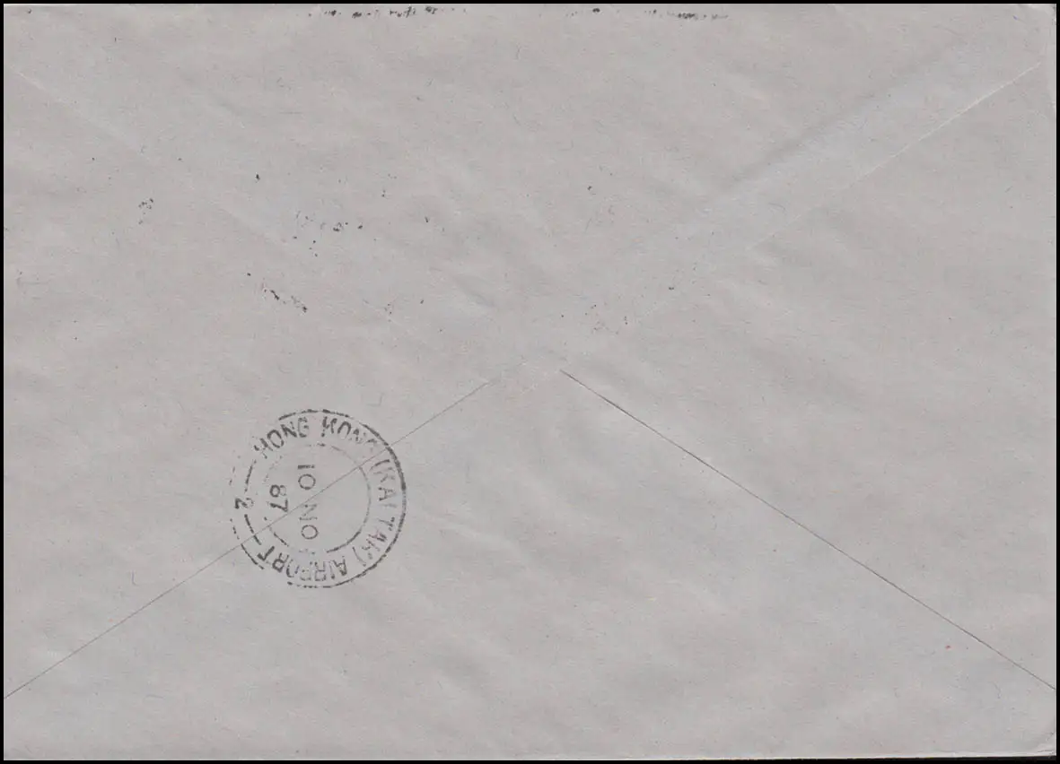Luftpostbrief nach Hong Kong Ankunftsstempel HONG KONG (TAI TAK) AIRPOSRT 10.11.87
