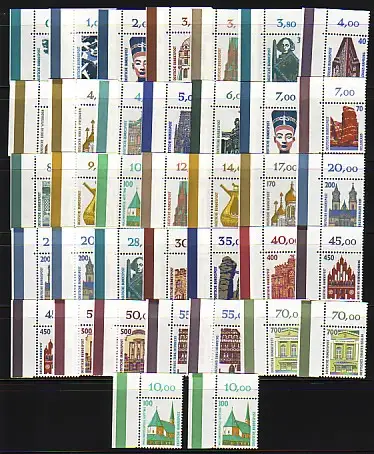 Schönes Set aller existierender Wertstufen-Balken-Varianten der Bogenecken oben links. Balken mit Naht, Balken ohne Naht - darunter auch die beiden Nahtvarianten der 200er braun und blau sowie die 100er Nachauflage mit weißer Gummierung mit und ohne Naht. Selten angebotene, komplette Kollektion - wie abgebildet.