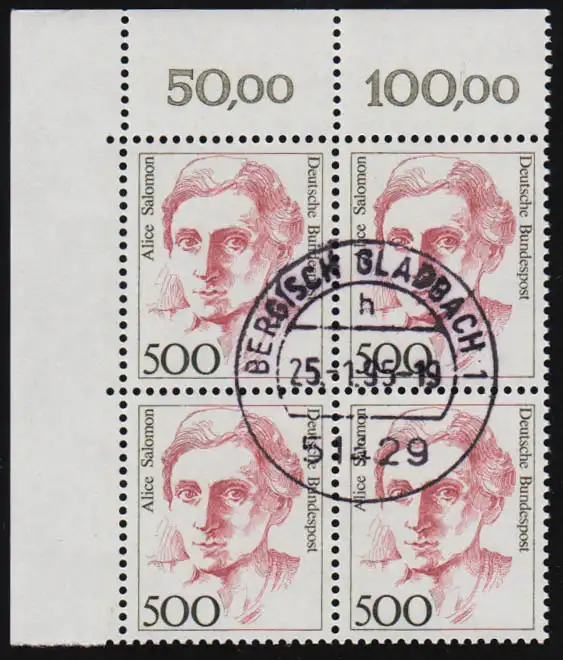 1397 Frauen 500 Pf Salomon Eckrand-Viererblock oben links, zentrischer Tages-O