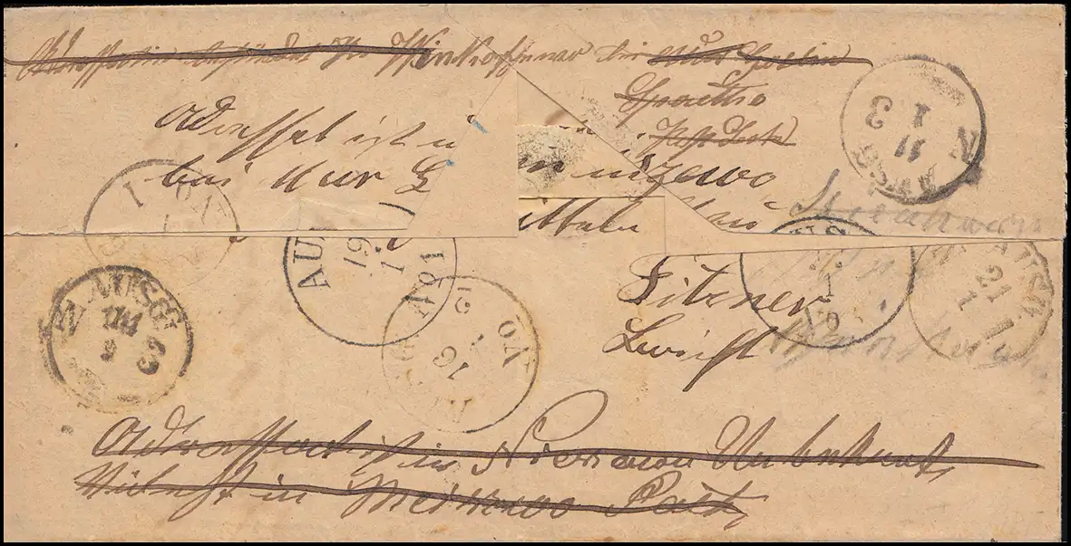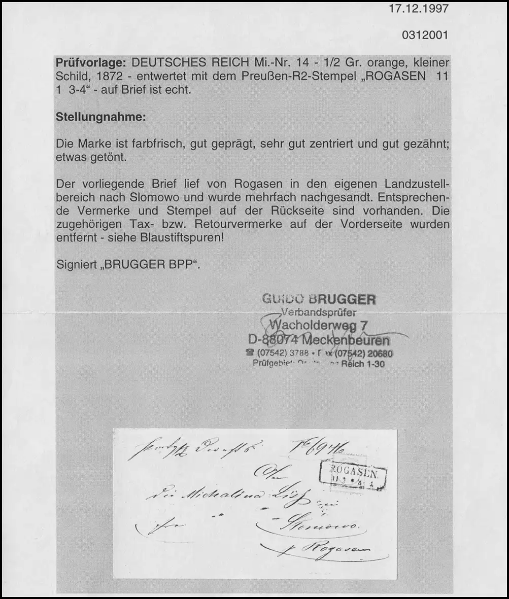 Mehrfach nachgesandte, beschnittene Grundbuchsache als Faltbrief nach Slomowo / Rogasen / Preußen mit R2-Stempel ROGASEN. Diverse rückseitige Ankunfts- / Durchgangsstempel. Sehr interessante Verwendung, Signiert und Befund Brugger BPP.