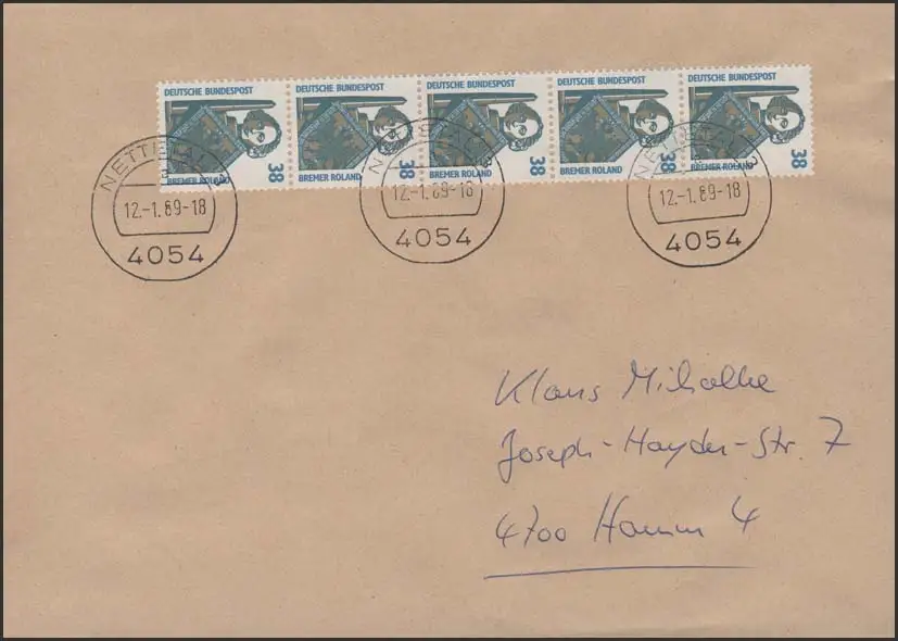 Rollenmarken-5er-Streifen je mit Nummer, portogerechter Ersttagsbrief