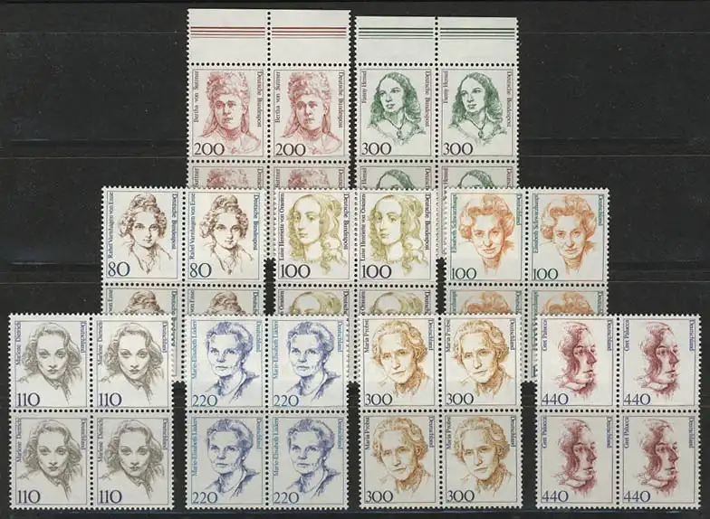 1433ff Frauen aus Zehnerbogen in DM 9 Werte Viererblöcke, postfrisch **