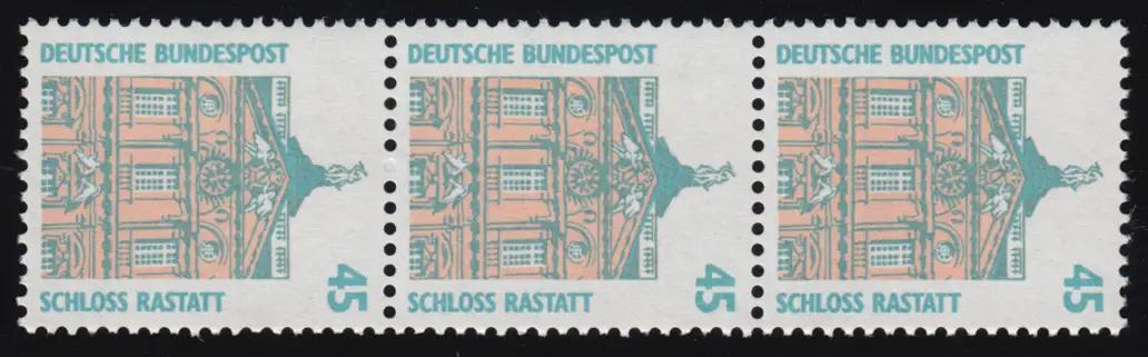 Schöne Einheit aus der Großrolle mit der Besonderheit Stanzrest im Zähnungsloch zwischen der mittleren und unteren Marke. Die obere Marke hat die für die Großrolle typische vierstelligen Zählnummer auf der Rückseite.