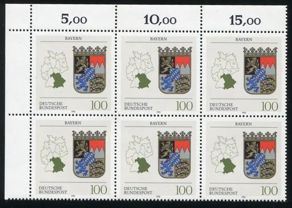 Eckrand-6er-Block oben rechts mit Plattenfehler: punktartige Verlängerung am Rechteck auf Feld 1, weißer Punkt oben im grünmarkierten Bundesland Bayern auf Feld 6 und auf Feld 8: Kerbe im Löwenoberschenkel.