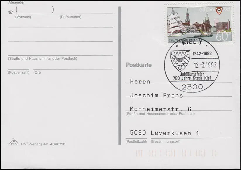 1598 Kiel EF FDC-Postkarte ESSt Kiel Jubiläumsfeier 750 Jahre Kiel 12.3.1992