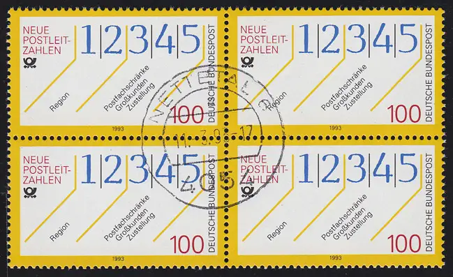 1659 Neue Postleitzahlen: Viererblock, zentrischer Vollstempel NETTETAL 11.3.95