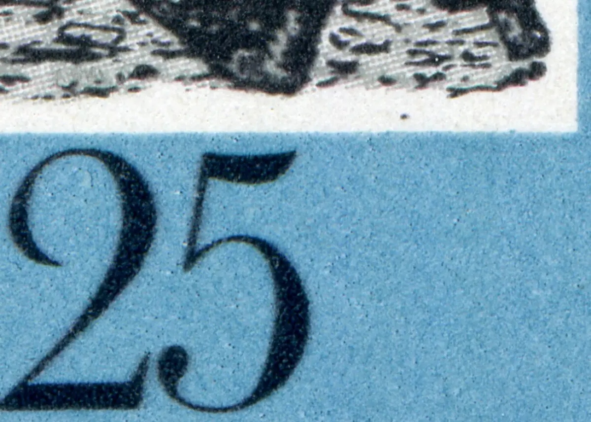 Plattenfehler beim 25-Pfennig-Wert: schwarzer Punkt im weißen Rahmen schräg über der 25
