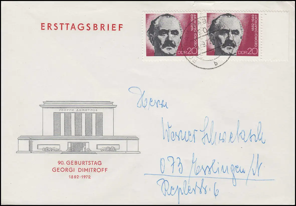 1784 Dimitrow 1972 - Randpaar auf FDC ET-O POTSDAM-BABELSBERG nach Esslingen