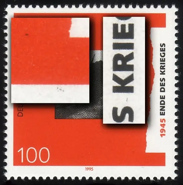 schwarzer Punkt vor K von KRIEGES, schwarzer unten rechts im Rot und schwarze Punkte unten rechts im Weiß