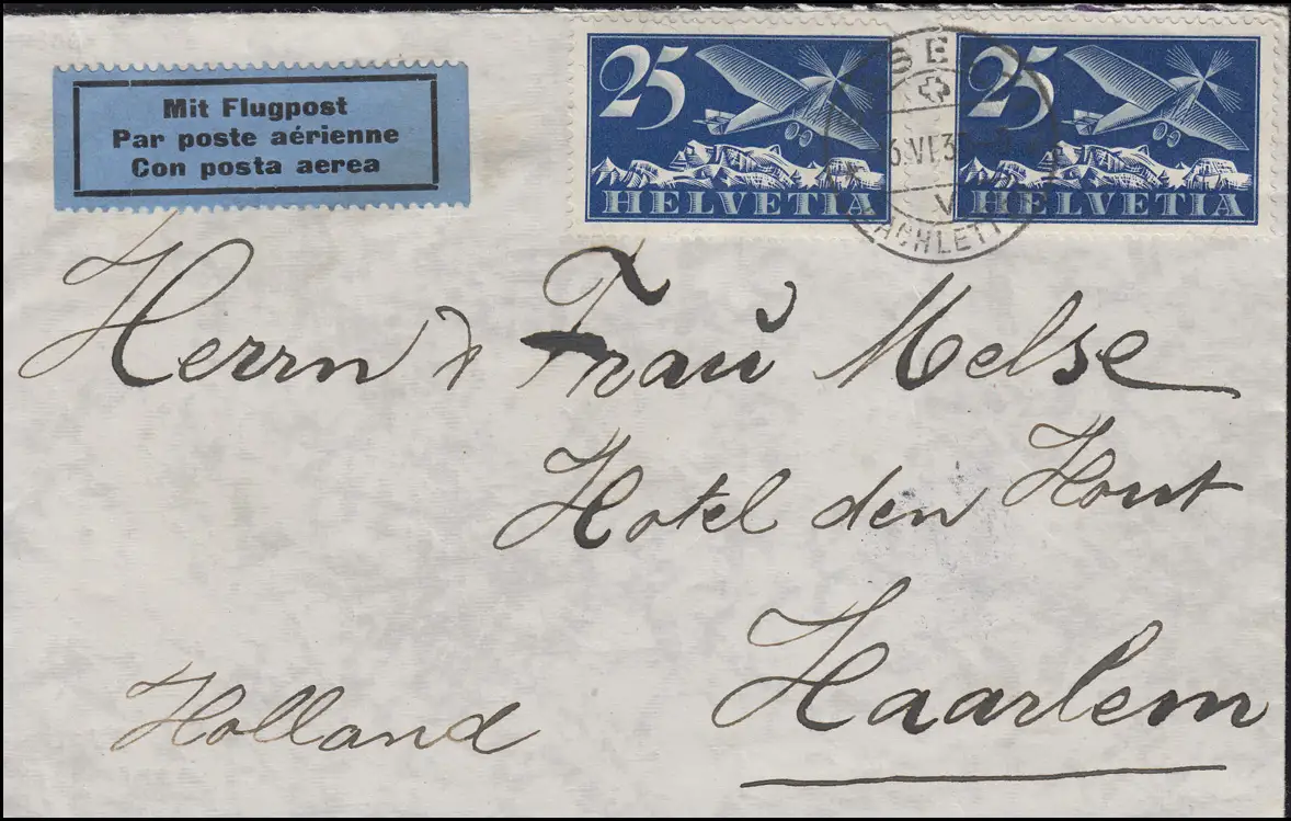 180 Flugpostmarken 2mal 25 C. MeF auf Luftpostbrief BASEL 16.6.30 (?) n. Haarlem