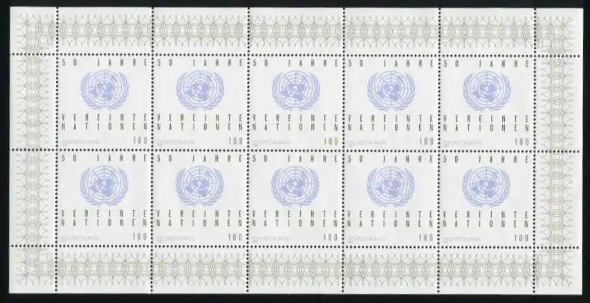 Kleinbogen mit MICHEL-Plattenfehler I: senkrechte Linie neben Afrika fast unterbrochen (verschiedene Stadien des Fehlers bekannt)