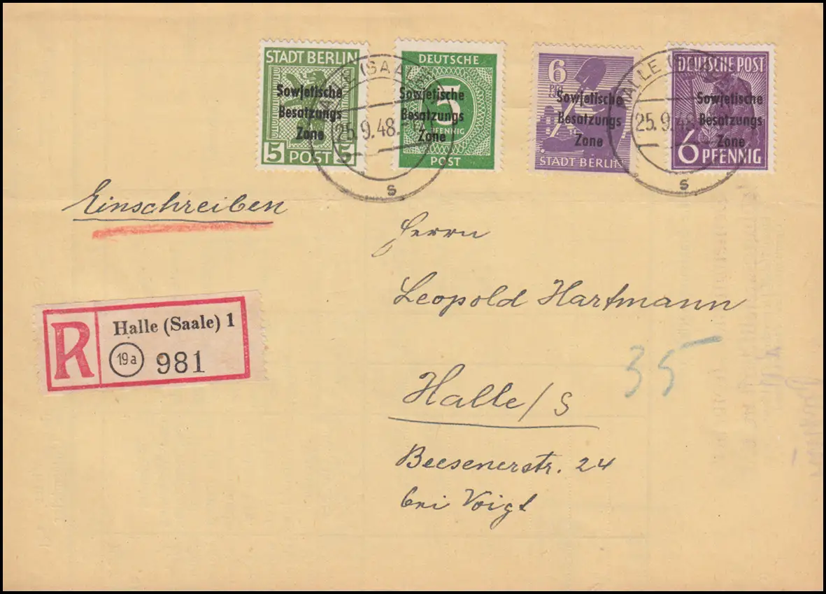 183+200A+201A+207 SBZ-Aufdrucke auf Orts-R-Brief HALLE (SAALE) 1 - 25.9.1948