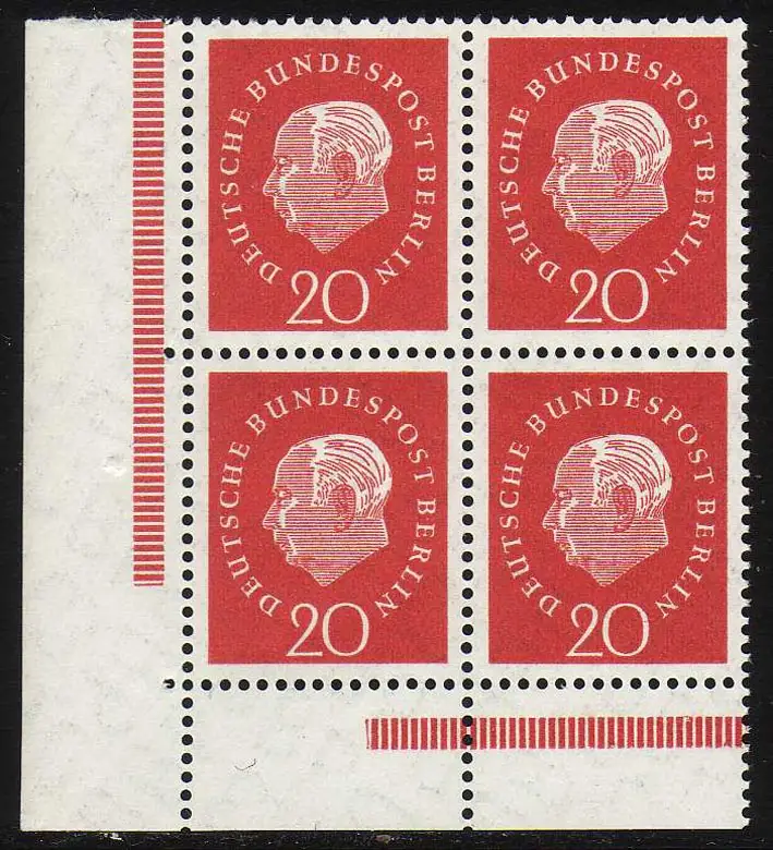 184v Heuss 20 Pf - Plattendruck/geriffelte Gummierung Eck-Vbl. ul **