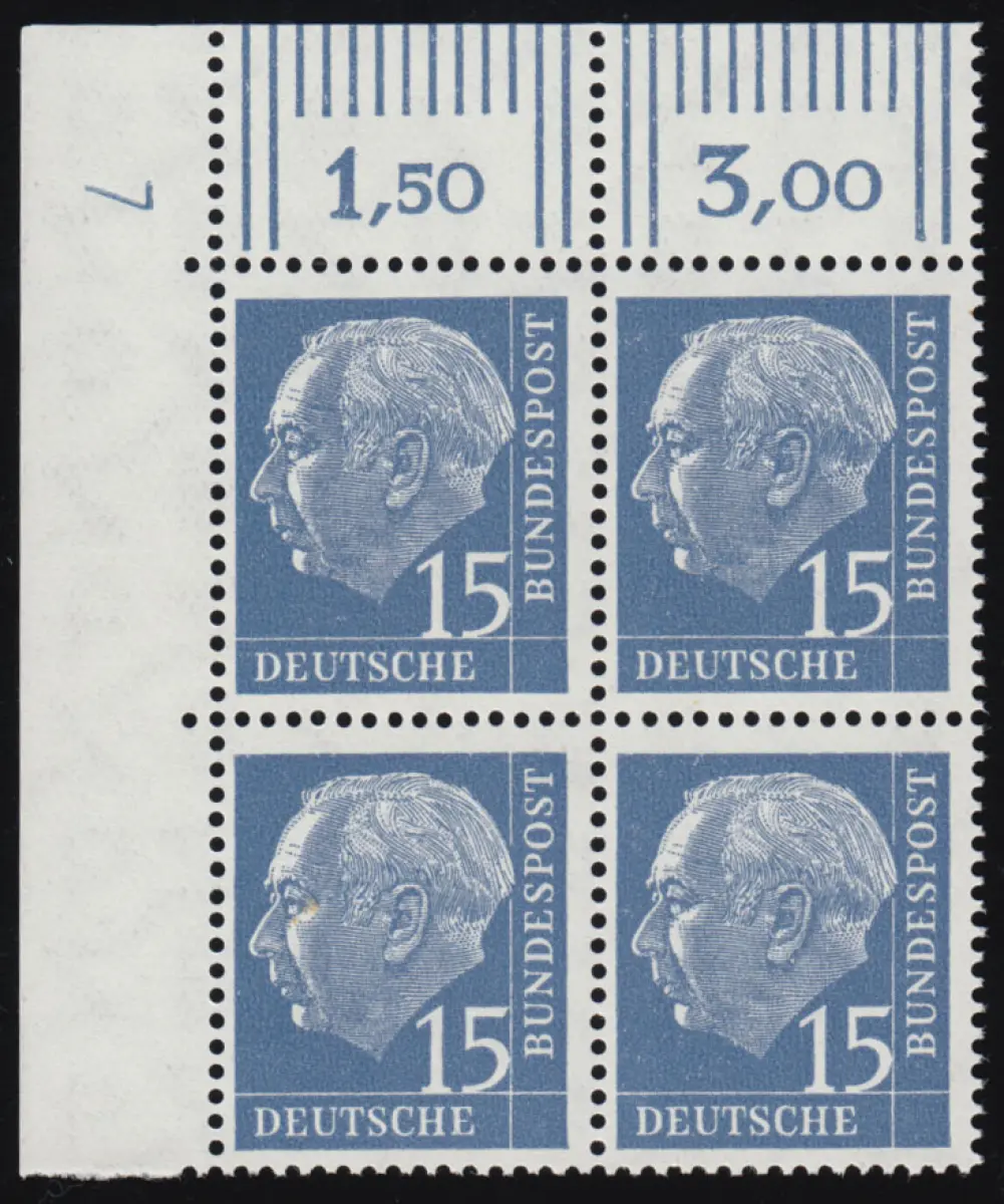 184xw Heuss 15 Pf ER-Viererblock oben links mit DZ 7 positiv, ungefaltet, **