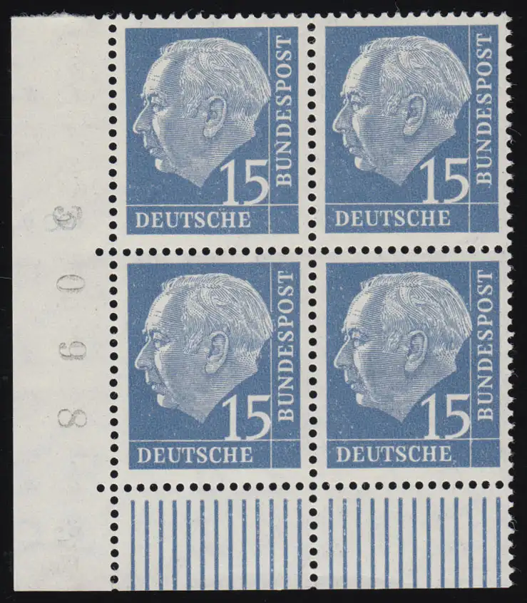 184xw Heuss 15 Pf ER-Viererblock unten links mit BRZ 4stellig, ungefaltet, **
