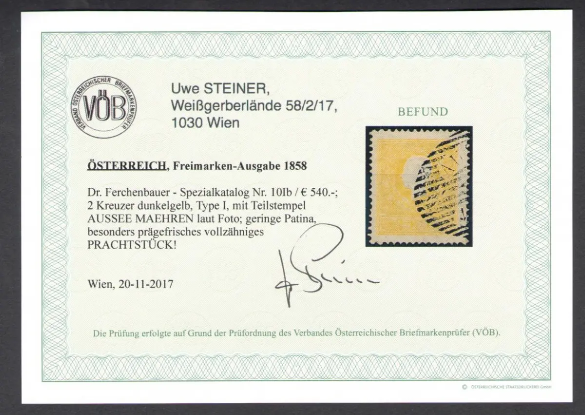 1858 Österreich, Abbild Kaiser Franz Joseph I., Nr. 6 - 2 gelbe Kreuzer gebraucht, Steiner Zertifikat Katalog Euro 550 Lot 50 Gian Febb