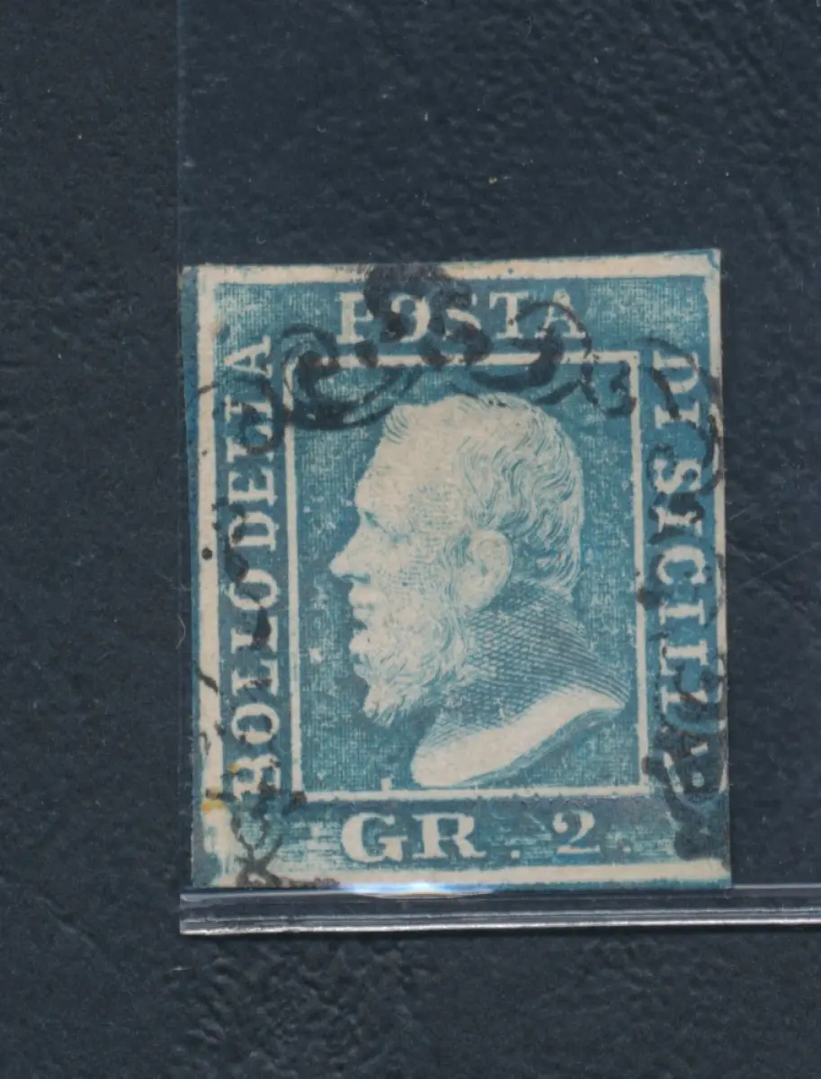 1859 SIZILIEN, Nr. 6 - 2 blaue Körnung, I Tafel, Retusche Nr. 82 hellblau GEBRAUCHT - Signiert Sorani ABBILDUNGEN VON FERDINAND II.