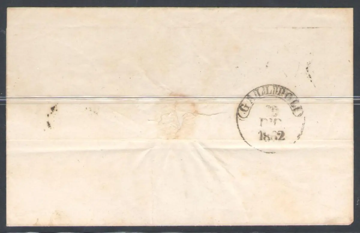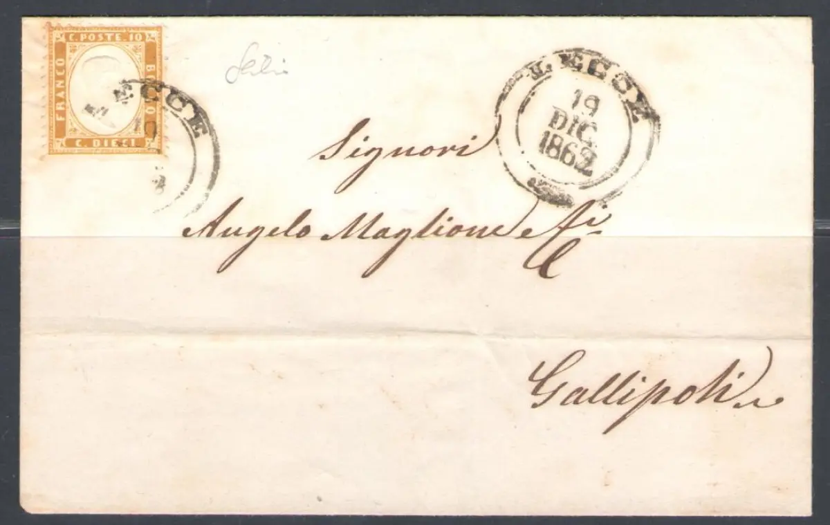 1862 Italia, n. 1K - 10 Cent Bistro Olive unten ungezähnt, gebraucht von Lecce für Gallipoli mit Ankunftsstempel auf der Rückseite Sächsischer Euro 2750 Katalog - Interessant - Los M