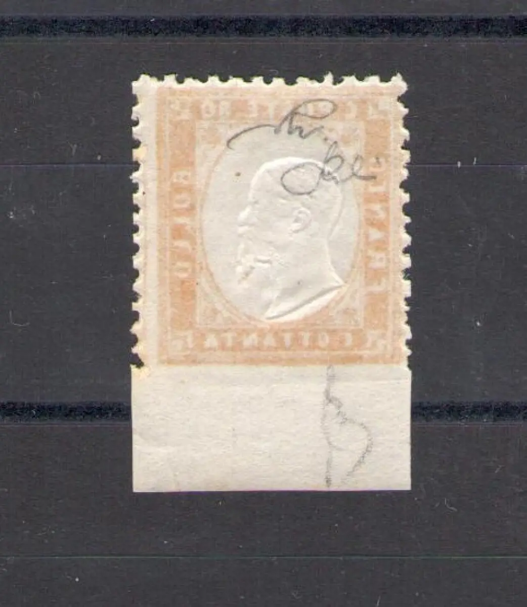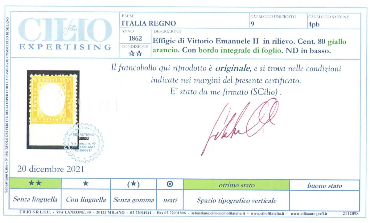 1862 Königreich Italien, Nr. 4pb - 80 Cent gelb orange mit integriertem Bogenrand unten und vertikalem Druckraum, Blattposition 50, postfrisch ** Sächsischer Eurokatalog 1750 - Album Bordeaux Königreich - Signatur auf der Rückseite Raybaudi - Chilio - Vaccari - Album Bordeaux Königreich