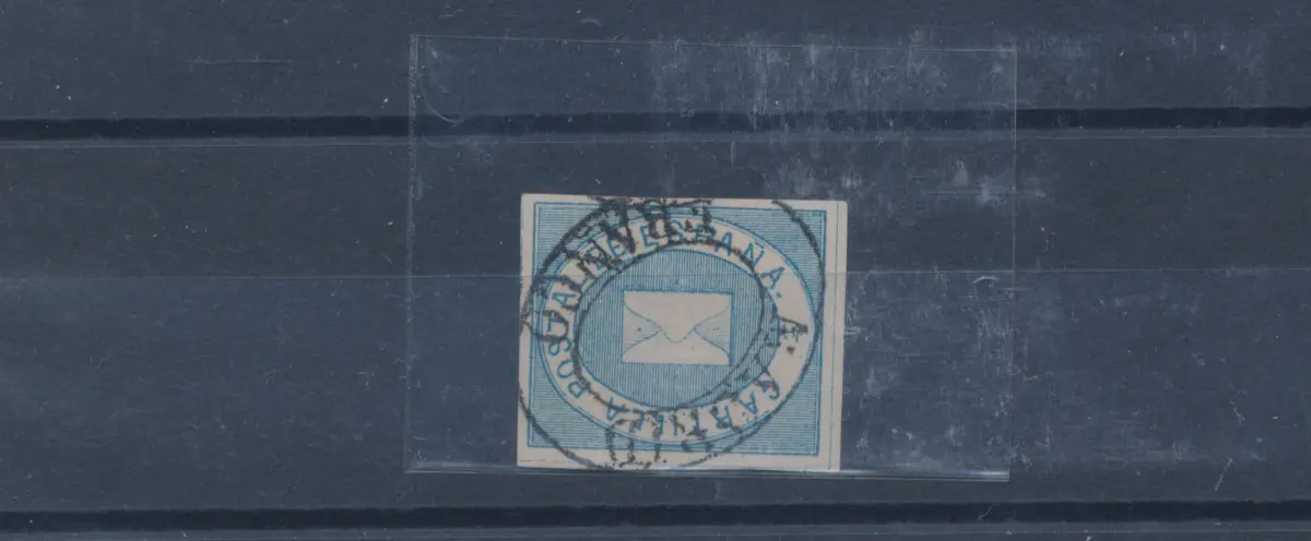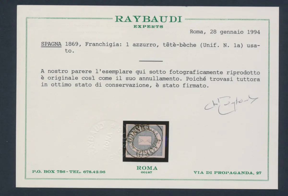 1869 SPANIEN, ESPANA, SPAIN, Franchise Nr. 1 hellblau, gebraucht, Raybaudi-Zertifikat.