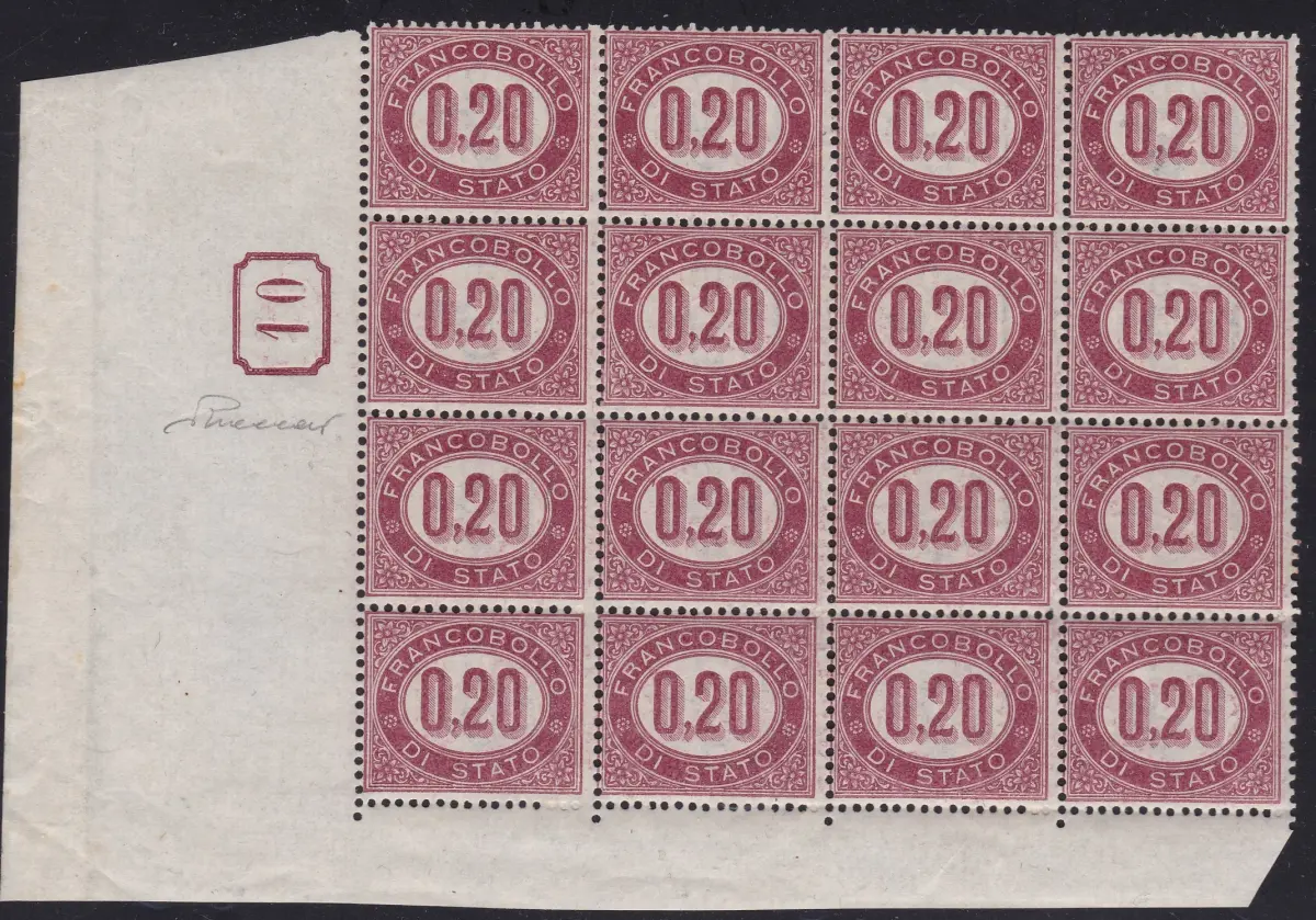 1875 ITALIEN - KÖNIGREICH, Service Nr. 3 MNH/** TISCHNUMMER 10 IM RECHTECK Wertziffer in einem Oval, Block mit 16 sächsischen Bogenrand Euro 375 Lot 83