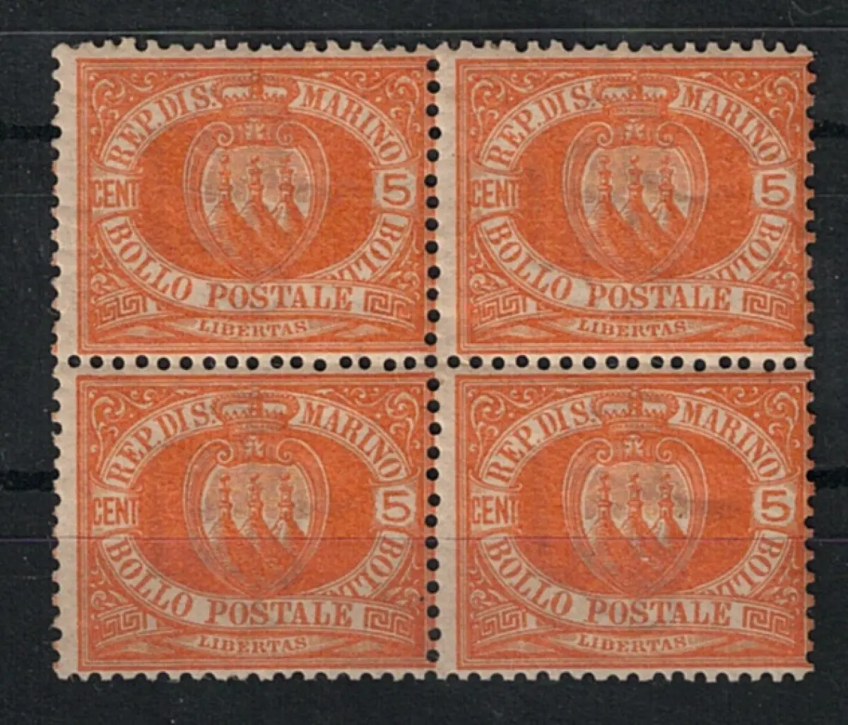 1877 SAN MARINO, # 2 - 5 Cent. gelb, Viererblock, postfrisch**