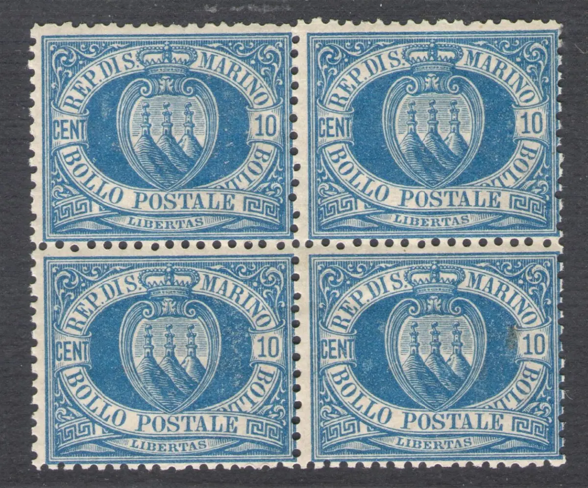 1877 SAN MARINO, Nr. 3A 10 Cent. hellblau diskrete Quartina Zentrierung MNH ** Kopie cert. Raybaudi GOLD aus Herkunft