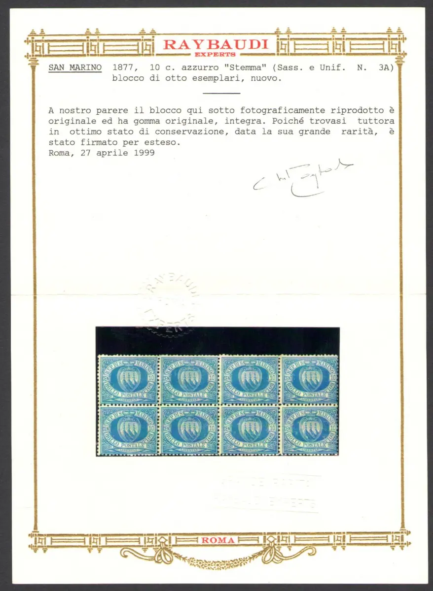 1877 SAN MARINO, Nr. 3A 10 Cent. hellblau MNH/** Cert. Raybaudi GOLD (Kopie) Quarz aus 8-teiligem Block Raybaudi Gold zertifiziert.