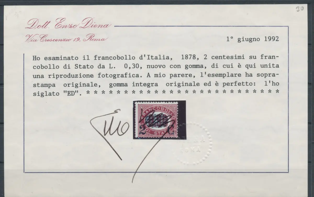 1878 Italien - Königreich, Nr. 32 - 2 Cent. auf 0,30 Lack, Service überdruckt, postfrisch** - Diena Zertifikat