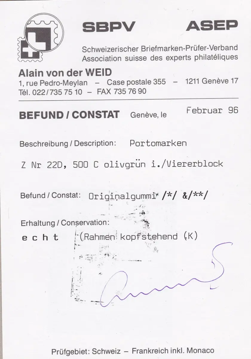 1889-91 Schweiz, Steuern Katalog Zumstein Nr. 22D - 500 olivgrün QUARTINA MLH* - MNH** SBPV Zertifikat - Von der Weid 2 Werte */MLH, 2 Werte MNH/** Zumstein Katalog A/Lot 14