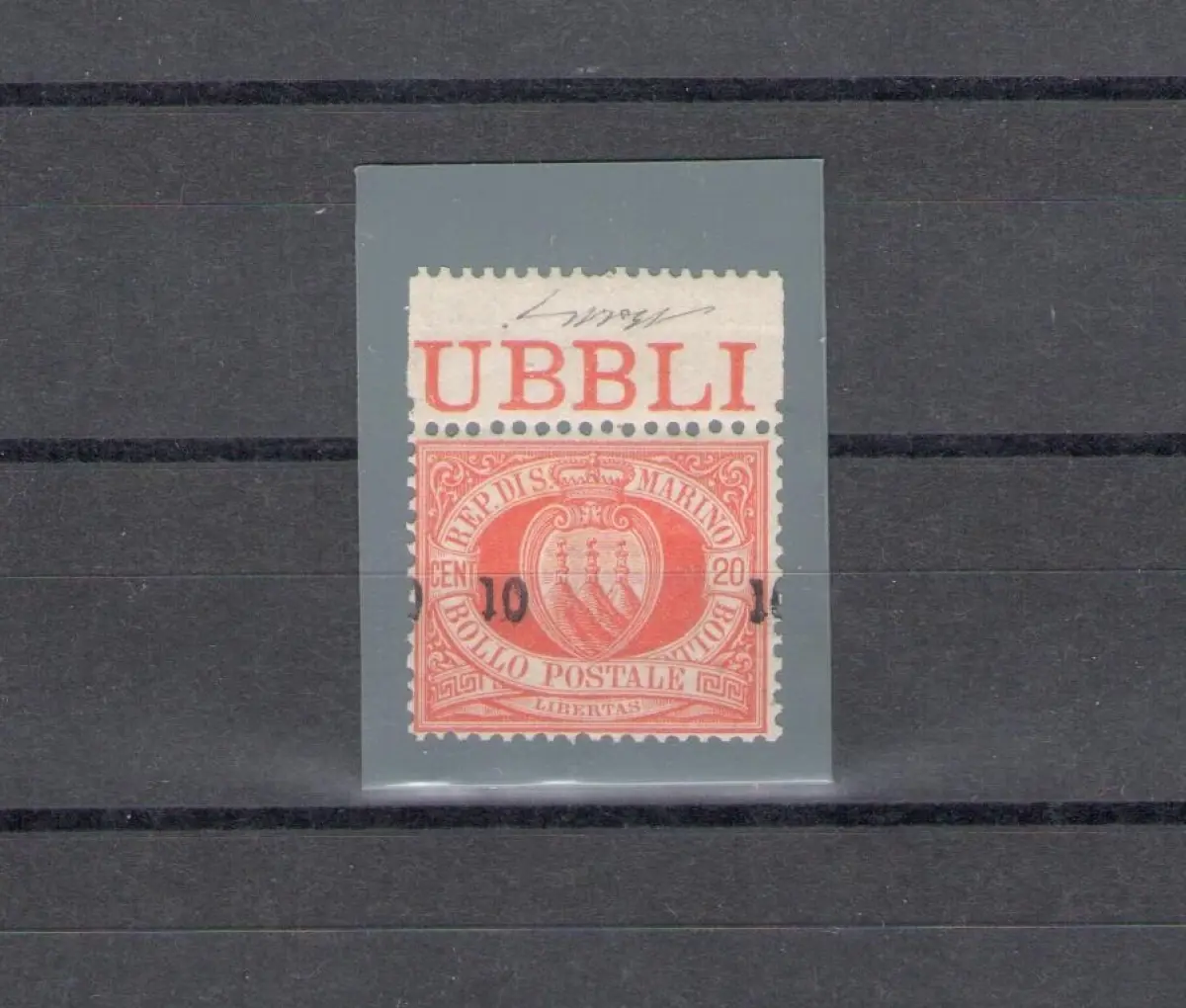 1892 SAN MARINO, Nr. 11h, 10 Cent auf 20 Cent rot - Aufdruck stark senkrecht verschoben - Zertifikat Chilio - MNH ** Wie aus dem Zertifikat im Aufdruck hervorgeht, ist nur die Ziffer 10 und rechts eine 1 zu sehen, sehr schön als Sorte, die Briefmarke ist neu und mit Originalgummi und Vollgummi sehr gut zentriert!!!!!!!
