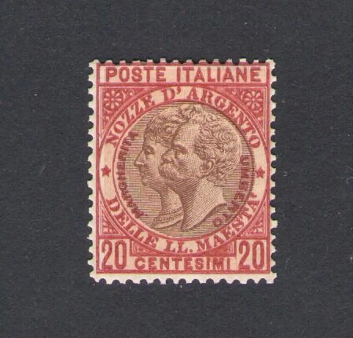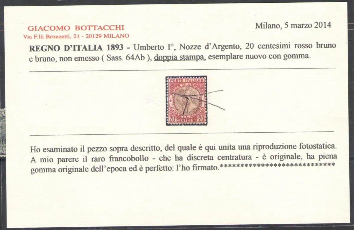 1893 KÖNIGREICH - Nr. 64A Silberhochzeit Umberto I. und Königin Margherita nicht ausgegeben, Doppeldruck, MH * Zertifikat BOTTACCHI, Originalgummi der Zeit, diskret zentriert, MH * Originalgummi mit Linguella.