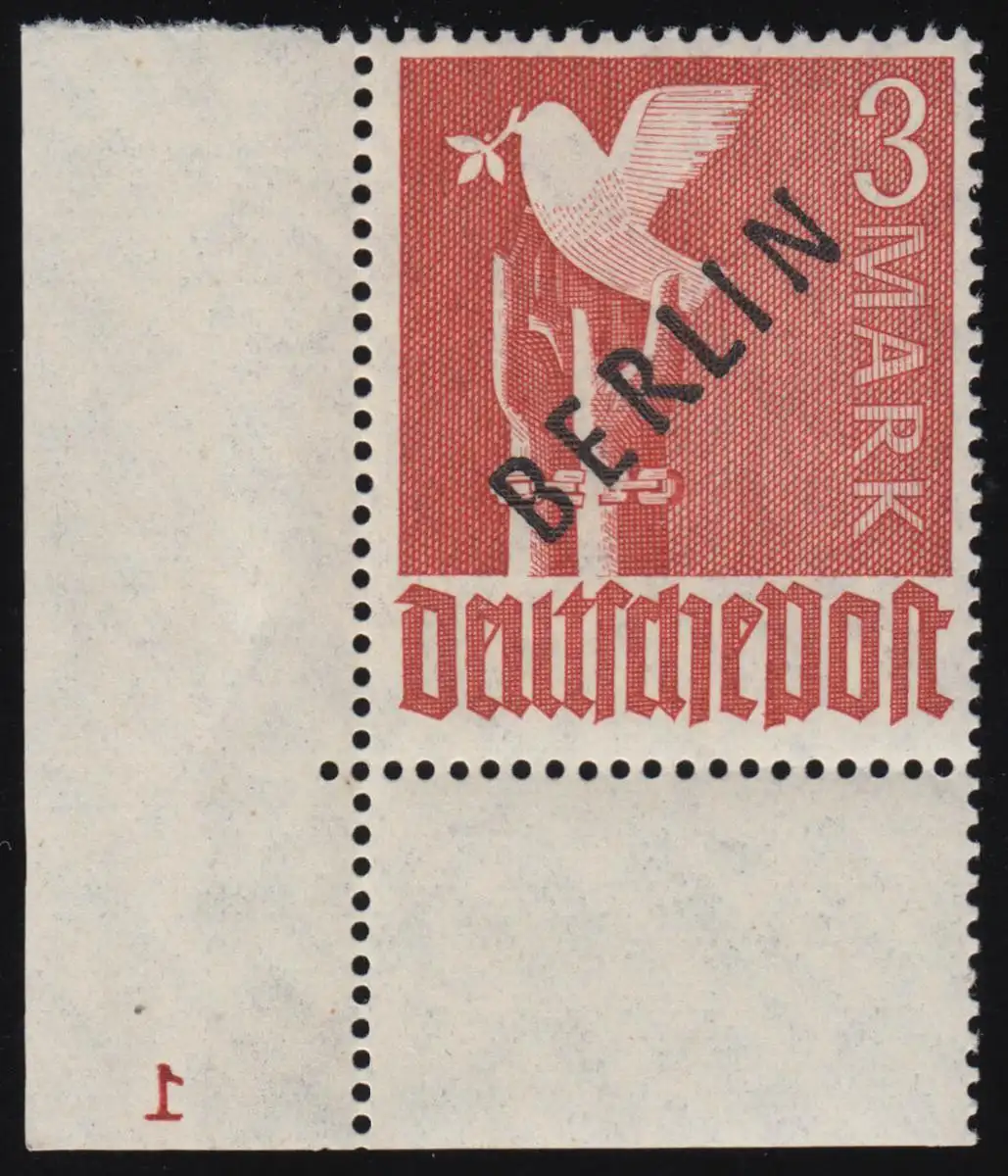 19 Pl.Nr. BERLIN Schwarzaufdruck 3 Mark Ecke unten links mit Plattennummer 1, **