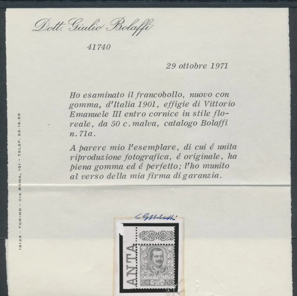 1901 Königreich Italien, Nr. 76, Floral 50 Cent Malve, postfrisch ** Bolaffi-Zertifikat - Bogenwinkel - Seltener sächsischer Katalog Euro 3750 - Neue Briefmarke mit Vollgummi und Original, sehr schön und Bogenwinkel.