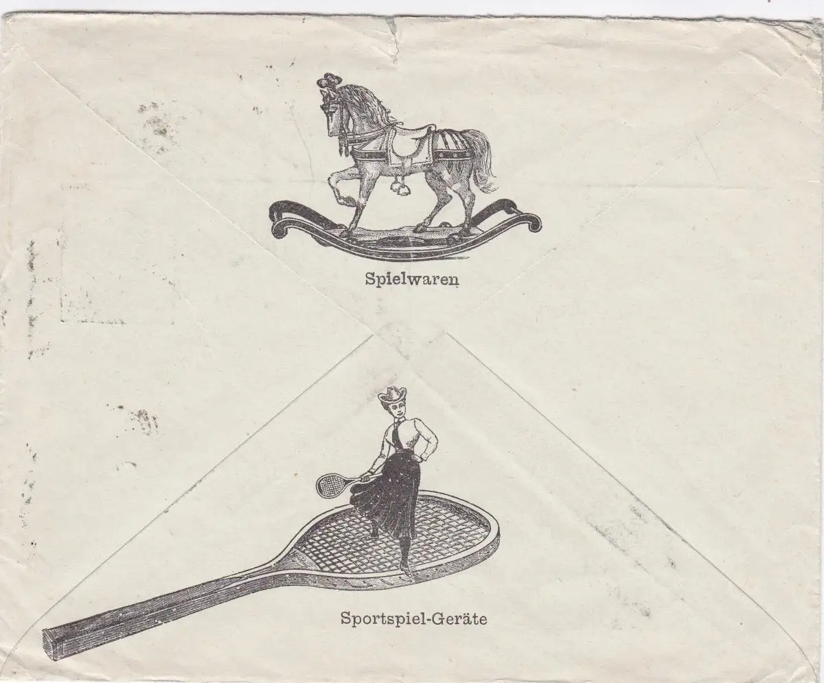1910: Brief von Wien nach Stuttgart, Rückseitig Schaukelpferd, Tennisschläger