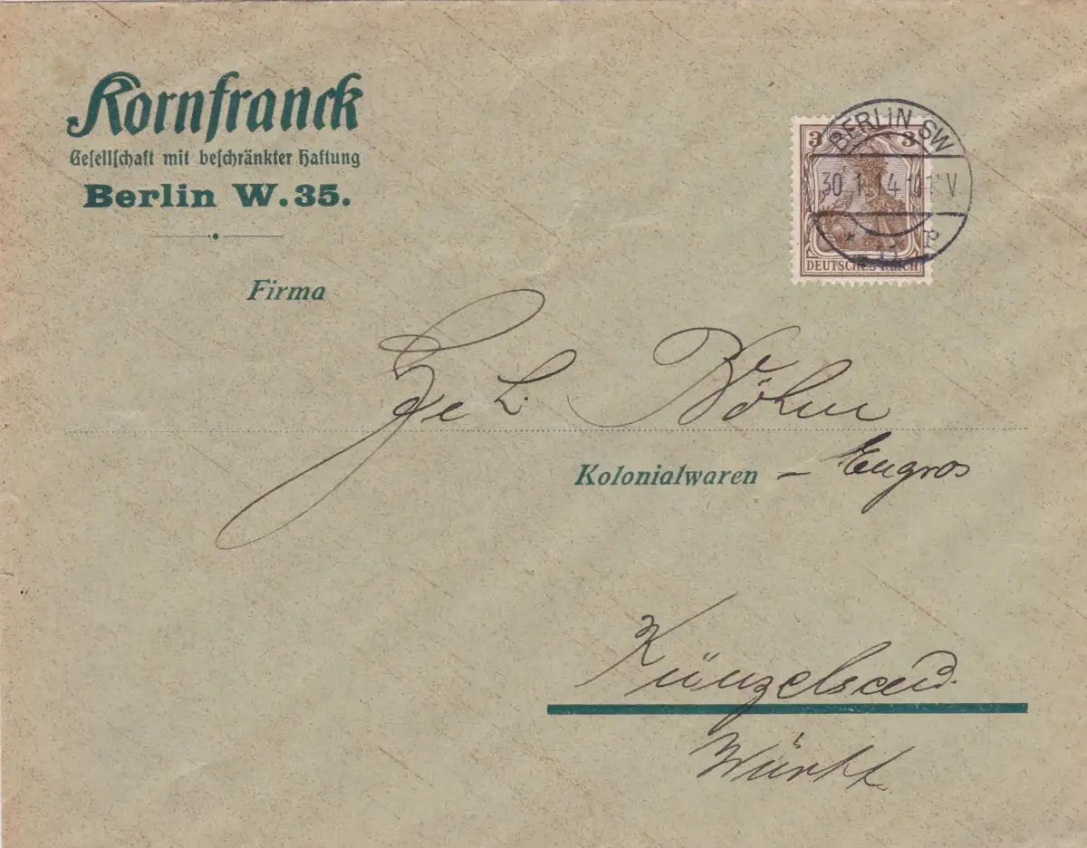 1914: Brief Berlin nach Künzelsau-Kolonialwaren,frankiert durch Frankiermaschine