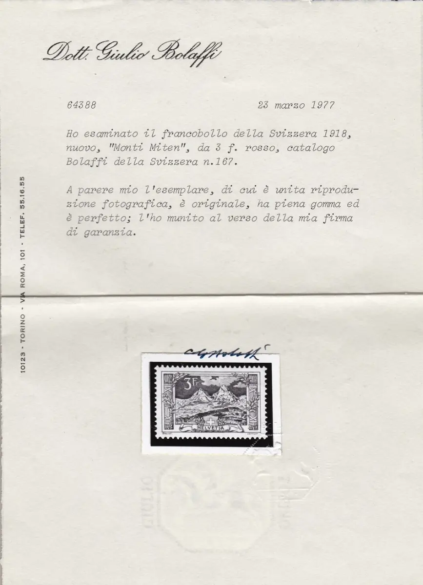 1918 SCHWEIZ, Nr. 167 Monti Miten, 3 Franken rot postfrisch** - Bolaffi Zertifikat Einheitskatalog Euro 400 Auslandskarton + 1 Lot 53 grüner Postkartenordner